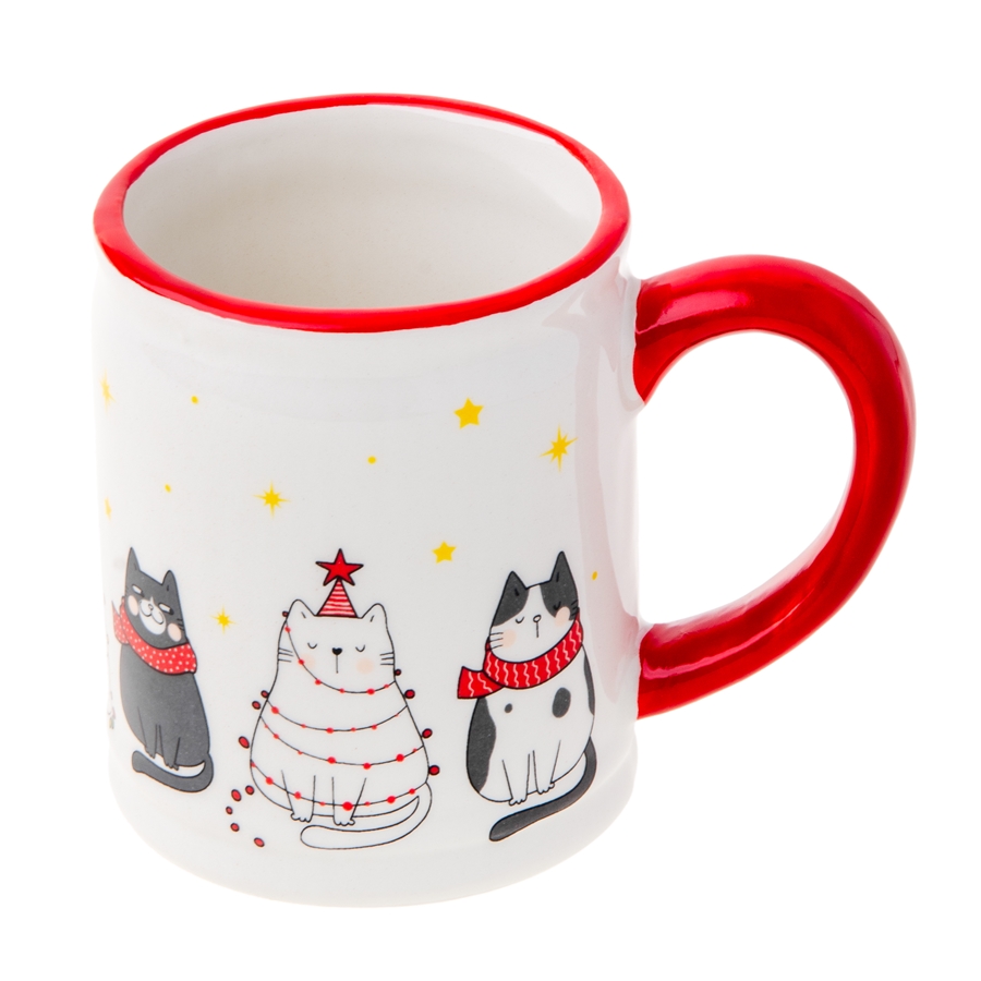 KATLIN Urocza kolekcja świątecznej ceramiki z motywem wesołych kotów w zimowych stylizacjach. Czerwone akcenty dodają jej ciepła i energii, tworząc radosny, przytulny klimat idealny na świąteczny stół. KATLIN Kubek – 335 ml Uroczy kubek z zimowym motywem kotów to idealny towarzysz chłodnych poranków. Wykonany z solidnej ceramiki, z pojemnością 335 ml i wygodną rączkę – w sam raz na gorącą czekoladę lub herbatę przy choince.