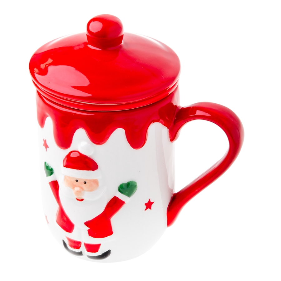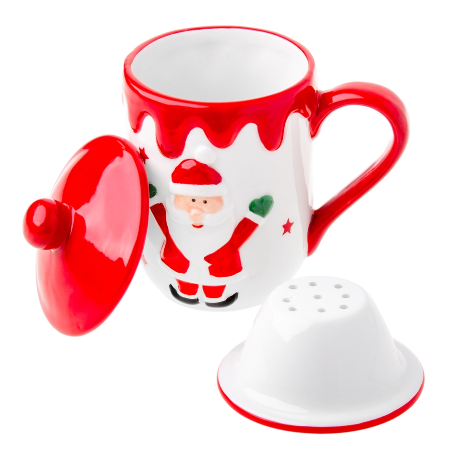 NIKLAS To świąteczna ceramika z wyrazistą dekoracją: czerwonym „lukrowanym” rantem i uroczym motywem Mikołaja wśród gwiazdek. Każdy element kolekcji wnosi do stołu ciepło, radość i lekko bajkowy klimat, idealny na zimowe spotkania i prezent. NIKLAS Kubek z zaparzaczem – 320 ml Kubek z zaparzaczem oraz pokrywką, w świątecznym motywie to idealny towarzysz chłodnych poranków. Wykonany z solidnej ceramiki, z pojemnością 320 ml i wygodną rączkę – w sam raz na gorącą herbatę przy choince.