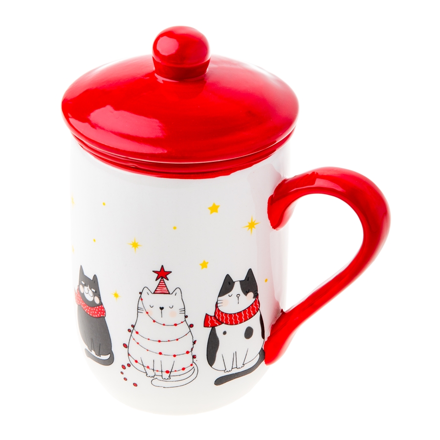 KATLIN Urocza kolekcja świątecznej ceramiki z motywem wesołych kotów w zimowych stylizacjach. Czerwone akcenty dodają jej ciepła i energii, tworząc radosny, przytulny klimat idealny na świąteczny stół. KATLIN Kubek z zaparzaczem – 320 ml Uroczy kubek z zaparzeczem i pokrywką, zimowy motyw kotów to idealny towarzysz chłodnych poranków. Wykonany z solidnej ceramiki, z pojemnością 320 ml i wygodną rączkę – w sam raz na gorącą herbatę przy choince.