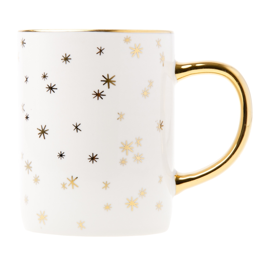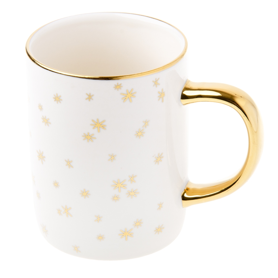 Kubek porcelanowy SOLAN – złote gwiazdy Elegancki kubek z subtelnym złotym akcentem, idealny na każdą okazję. Łatwy w czyszczeniu i zapakowany w estetyczne pudełko – doskonały pomysł na prezent.