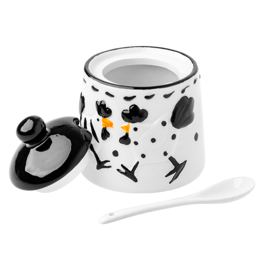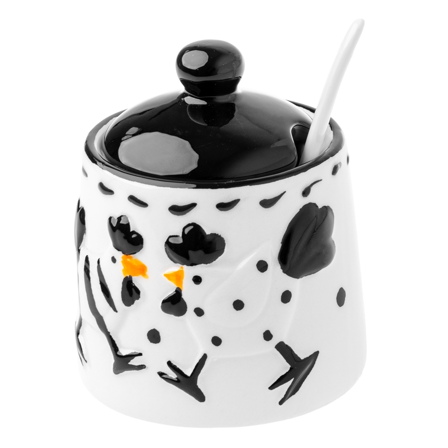 RIKU Cukiernica z łyżeczką Urocza cukiernica z motywem kurek to idealny dodatek do poranków. Wykonana z solidnej ceramiki, z czarnym wieczkiem i dołączoną łyżeczką – praktyczna i pełna uroku.