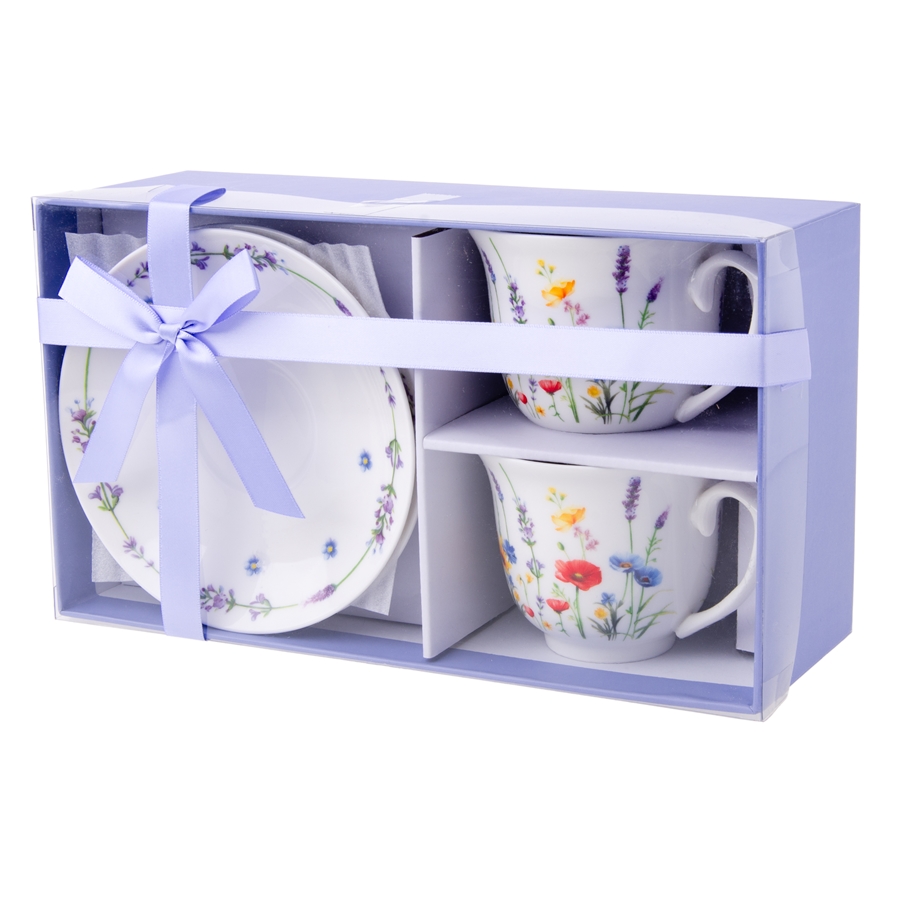 SOLEY Filiżanka i spodek (2+2) Zestaw filiżanek ze spodkami SOLEY (2+2) to elegancka propozycja wykonana z porcelany, idealna na każdą okazję. Czysta biel pięknie współgra z kolorowym, kwiatowym motywem, tworząc lekki i świeży charakter. Całość zapakowana jest w estetyczne pudełko prezentowe, a możliwość mycia w zmywarce zapewnia wygodę użytkowania na co dzień.