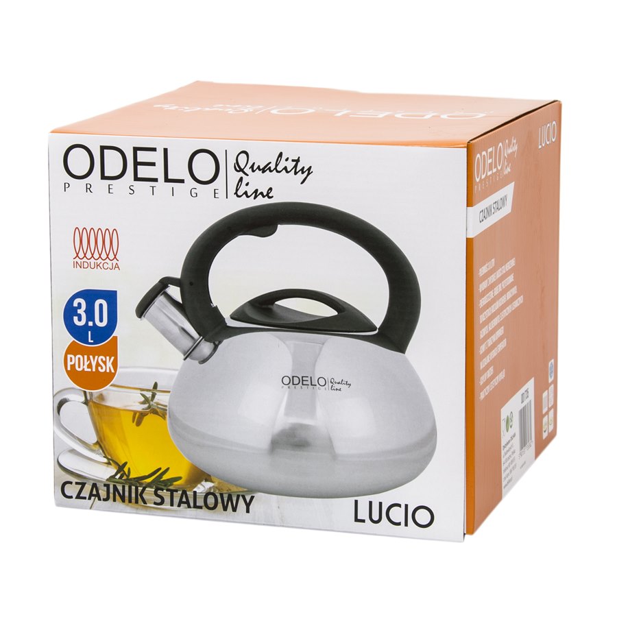 Czajnik stalowy LUCIO o pojemności 3L w połysku marki ODELO: wysokiej jakości stal nierdzewna, powierzchnia w połysku, odchylany gwizdek, otwierany za pomocą przycisku w uchwycie, poręczny uchwyt oraz ściąganą pokrywkę z uchwytem w tym samym kolorze co rączka, łączy cechy użytkowe z nowoczesnym wzornictwem, łatwy w utrzymaniu czystości, karton ozdobny. Specyfikacja: wysokość: 19cm średnica dna: 21.5cm pojemność: 3L