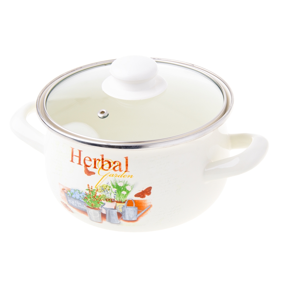 Garnek ZIOŁA – baryłka Garnek emaliowany ZIOŁA to praktyczne naczynie do codziennego gotowania. Wykonany ze stali i pokryty trwałą powłoką emaliowaną, skutecznie chroni przed korozją i pasuje do szerokiej gamy kuchenek. Kremowy kolor oraz motyw świeżych ziół dodają mu wyjątkowego charakteru, a szklana pokrywka i pojemność 3,8 L (średnica 20 cm) sprawiają, że świetnie sprawdzi się w każdej kuchni.