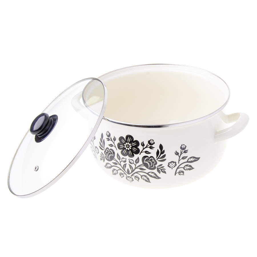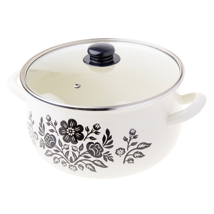 Garnek KWIATY – baryłka Garnek emaliowany KWIATY to praktyczne i stylowe naczynie do codziennego gotowania. Wykonany ze stali i pokryty trwałą powłoką emaliowaną, skutecznie chroni przed korozją i pasuje do szerokiej gamy kuchenek. Kremowy kolor oraz motyw czarnych kwiatów dodają mu wyjątkowego charakteru, a szklana pokrywka i pojemność 6,2 L (średnica 24 cm) sprawiają, że świetnie sprawdzi się w każdej kuchni.