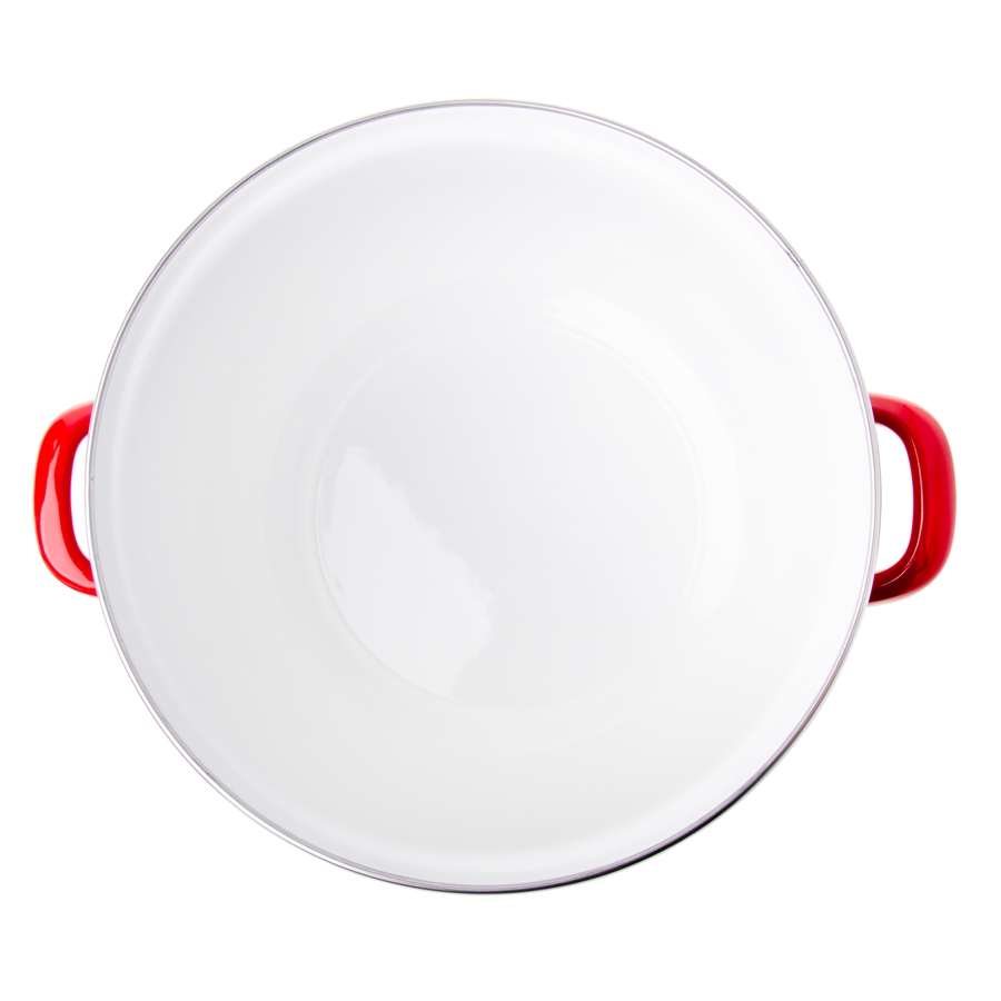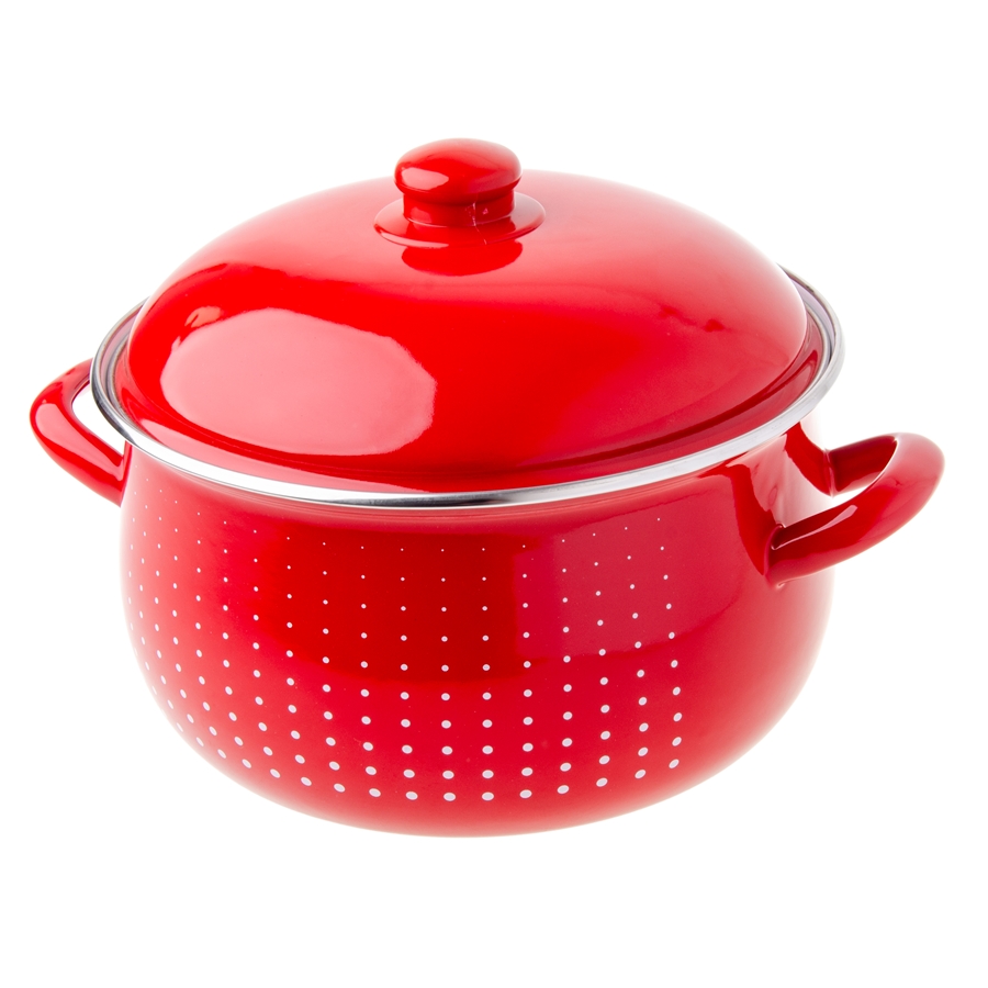 Garnek KROPKI – baryłka Garnek emaliowany KROPKI to praktyczne naczynie do codziennego gotowania. Wykonany ze stali i pokryty trwałą powłoką emaliowaną, skutecznie chroni przed korozją i pasuje do szerokiej gamy kuchenek. Czerwony kolor oraz kropki dodają mu wyjątkowego charakteru, a stalowa pokrywka (również pokryta emalią) i pojemność 6,2 L (średnica 24 cm) sprawiają, że świetnie sprawdzi się w każdej kuchni.