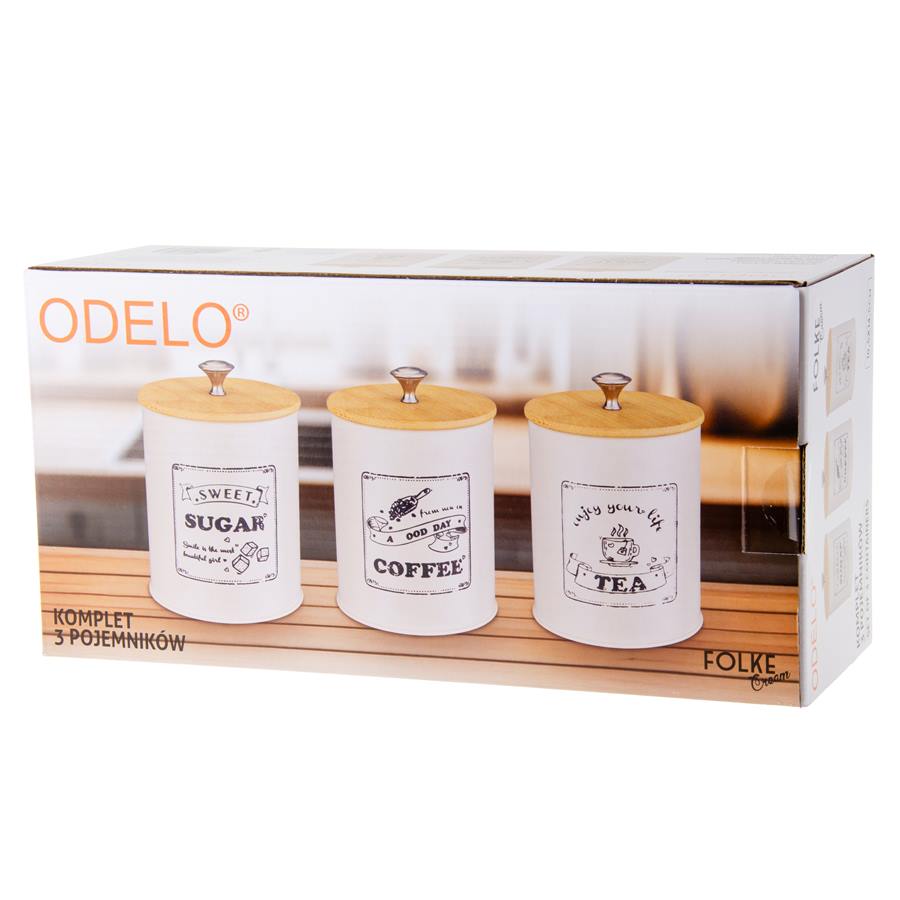 Komplet pojemników FOLKE Cream – styl i funkcjonalność w Twojej kuchni Zestaw 3 stalowych pojemników z bambusowymi pokrywami to idealne rozwiązanie do przechowywania cukru, kawy i herbaty. Utrzymane w stylu retro, łączą klasyczny wygląd z nowoczesną praktycznością. Stylowe i szczelne – doskonały akcent dekoracyjny i użytkowy.