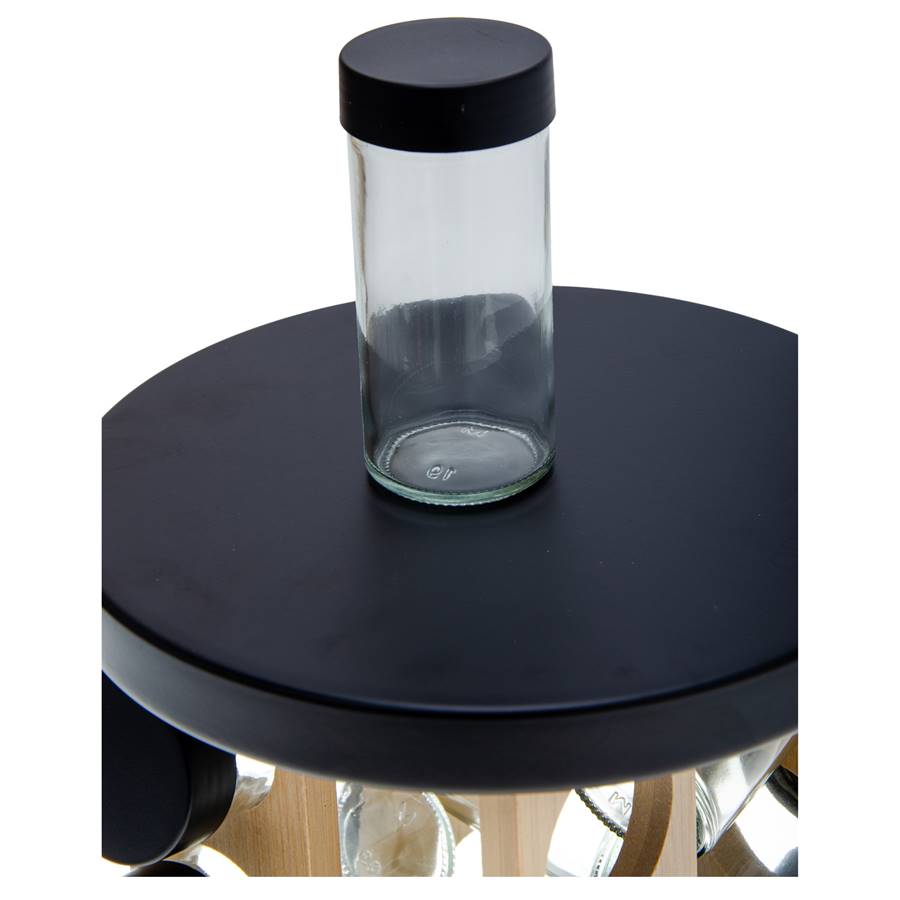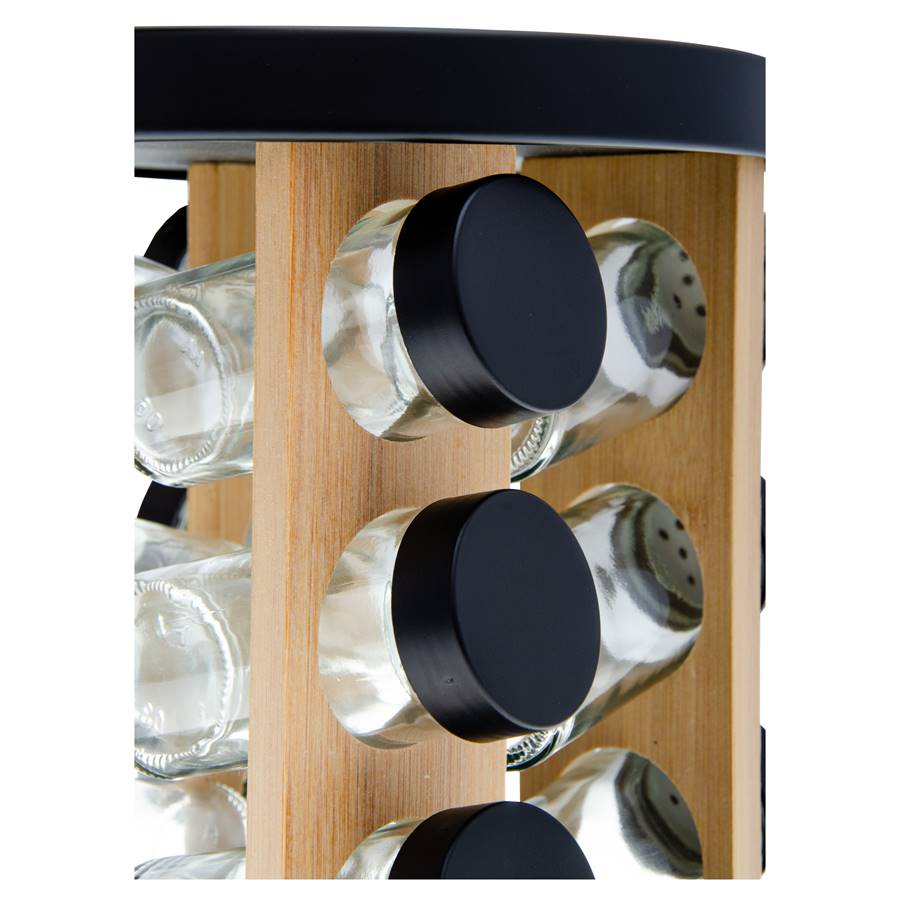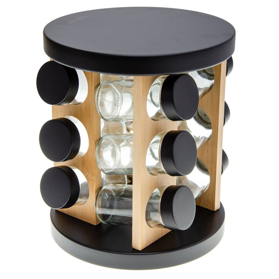- Materiał stojaka: Stal i drewno bambusowe Materiał pojemnika: szkło i tworzywo sztuczne Obrotowa i antypoślizgowa podstawa Pojemniki z zakrętkami są estetyczne i higienicze Stojak zajmuje niewiele miejsca Solidna konstrukcja DANE TECHNICZNE: